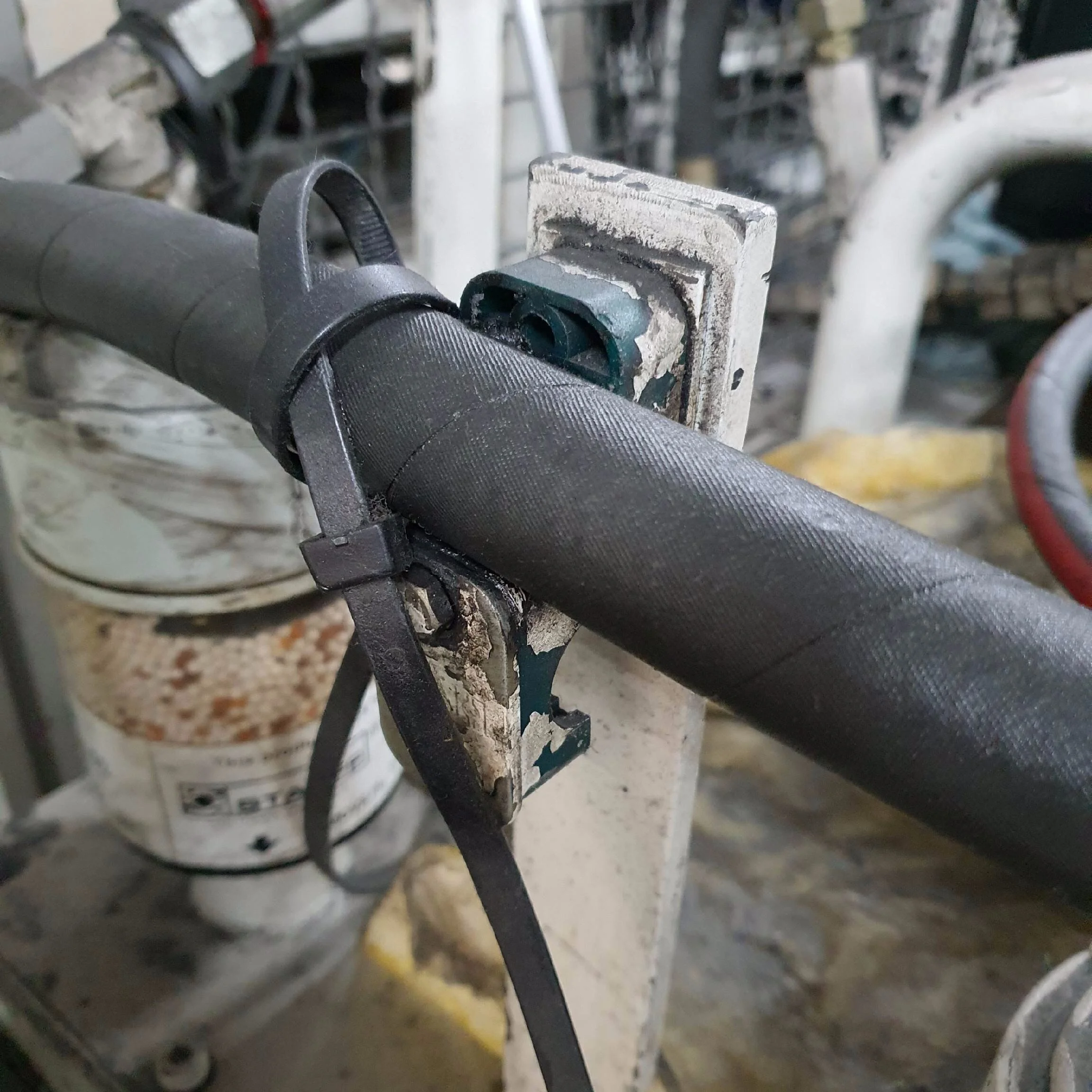 Green hose clamp is broken so, cable tie used to restrain hydraulic hose.