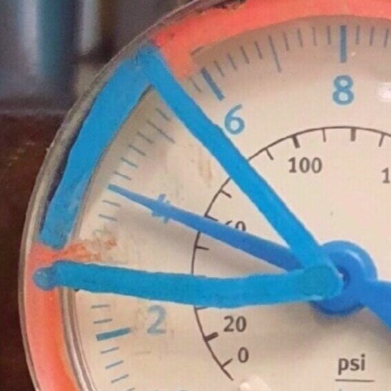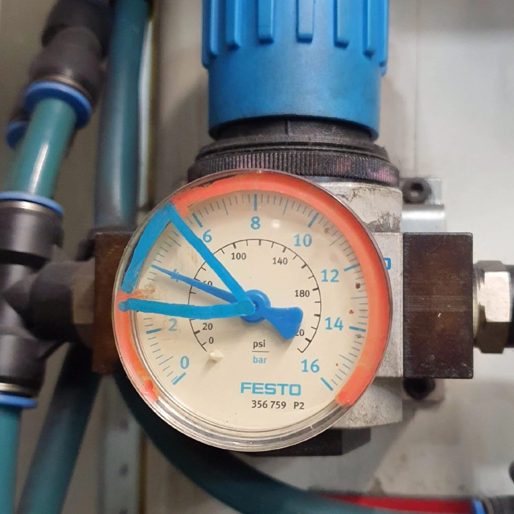 and a visual indication of the standard acceptable pressure range marked on the cylinder air-supply gauge.